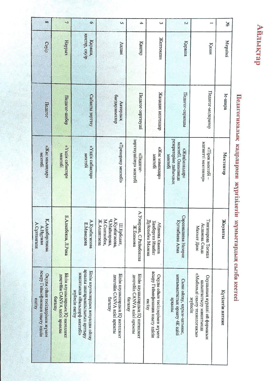 Педагогикалық кадрлармен жүргізілетін жұмыстардың сызба кестесі