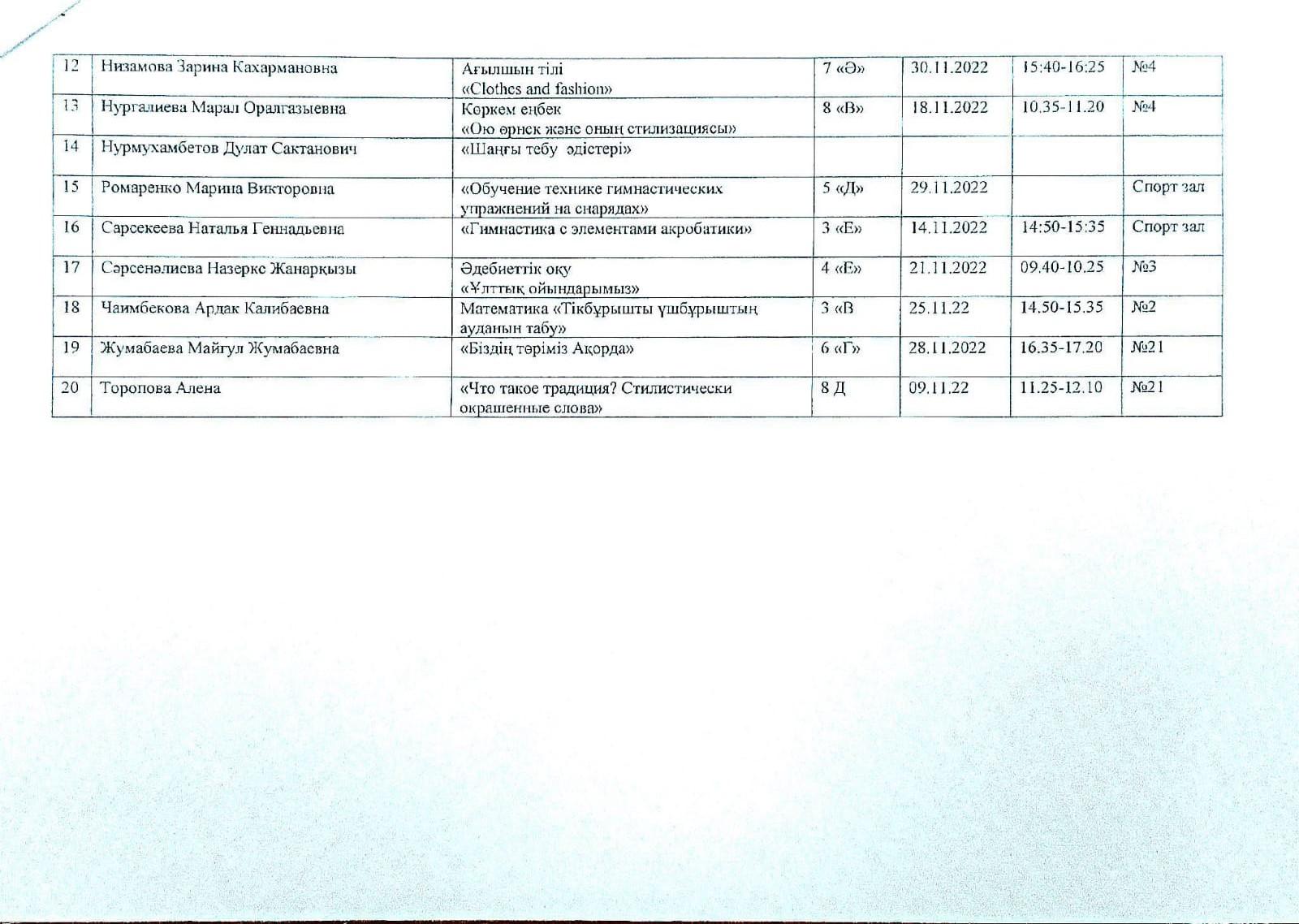 Педагог-сарапшылар айлығында ашық сабақтар өткізу кестесі