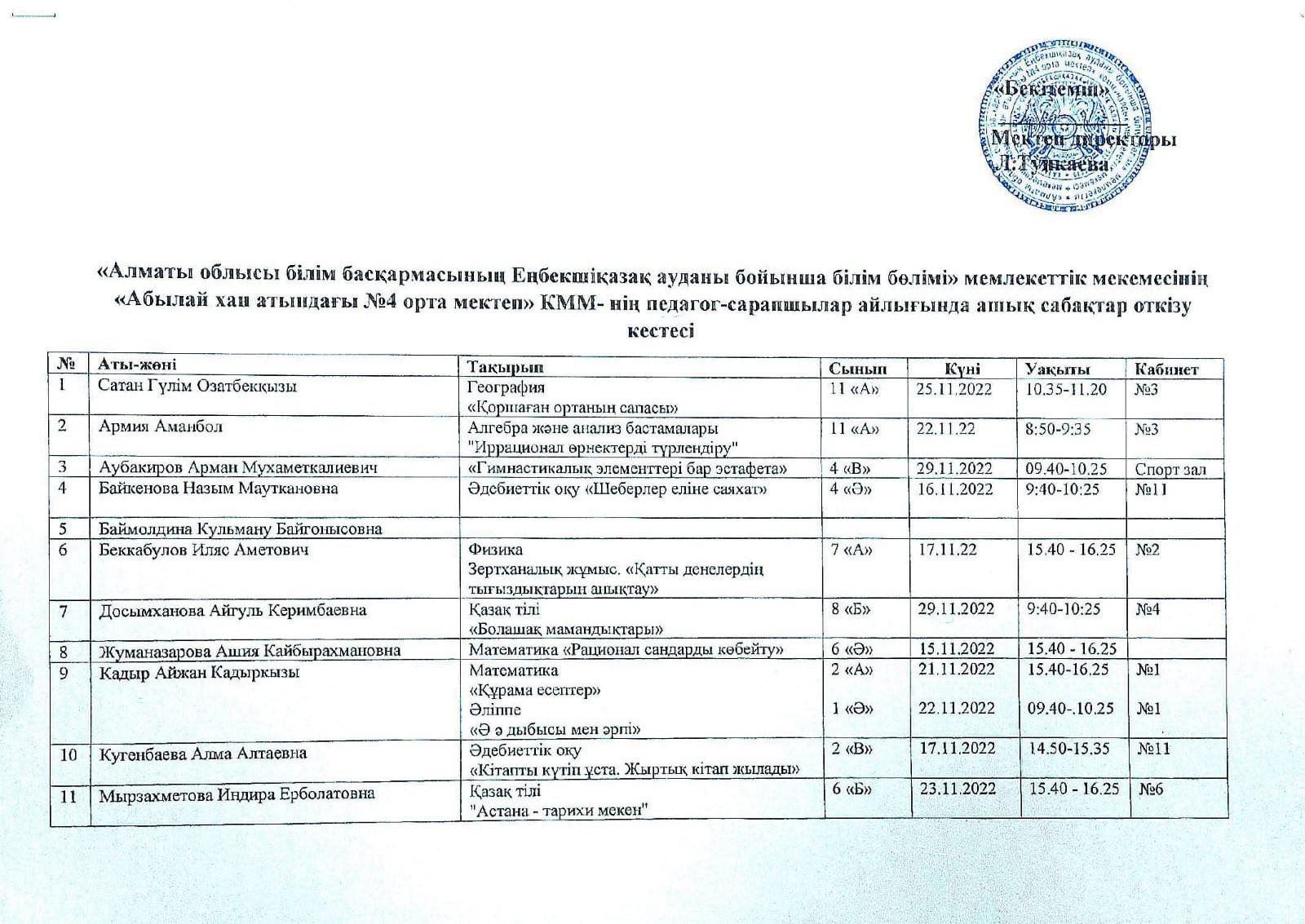 "Алматы облысы білім басқармасының Еңбекшіқазақ ауданы бойынша білім бөлімі" мемлекеттік мекемесінің "Абылай хан атындағы №4 орта мектеп" КММ-нің педагог-сарапшылар айлығында ашық сабақтар өткізу кестесі