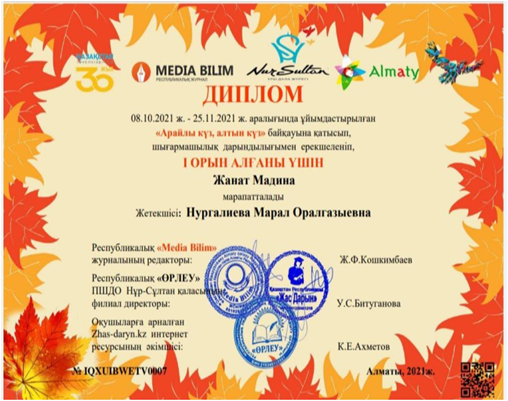 «Арайлы күз, алтын күз» республикалық байқауына қатысып, Жанат Мадина І орын алып, дипломымен марапатталды. Жетекшісі: Нургалиева Марал.