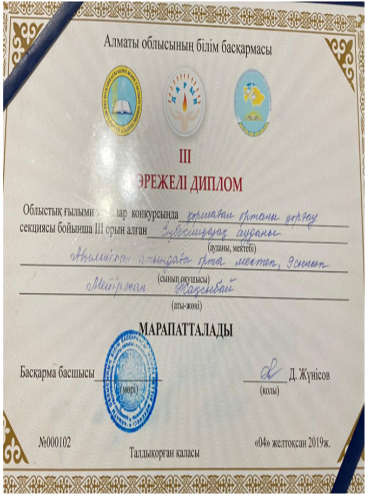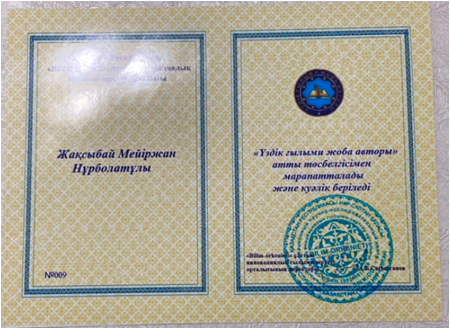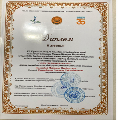 «Үздік ғылыми жоба -2021» атты республикалық байқауға қатысып, ІІ дәрежелі дипломмен марапатталды. «Үздік ғылыми жоба авторы» атты төсбелгісімен марапатталып, куәлігі берілді.