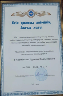 Ұстаздар күні мерекесіне орай Есік қаласынң әкімі А.Бошкулов мектеп ұжымына және математика пәні мұғалімі Г.Баймолдина мен орыс тілі пәні мұғалімі Н.Бейсембековаға арнап Алғыс хатын табыс етті.